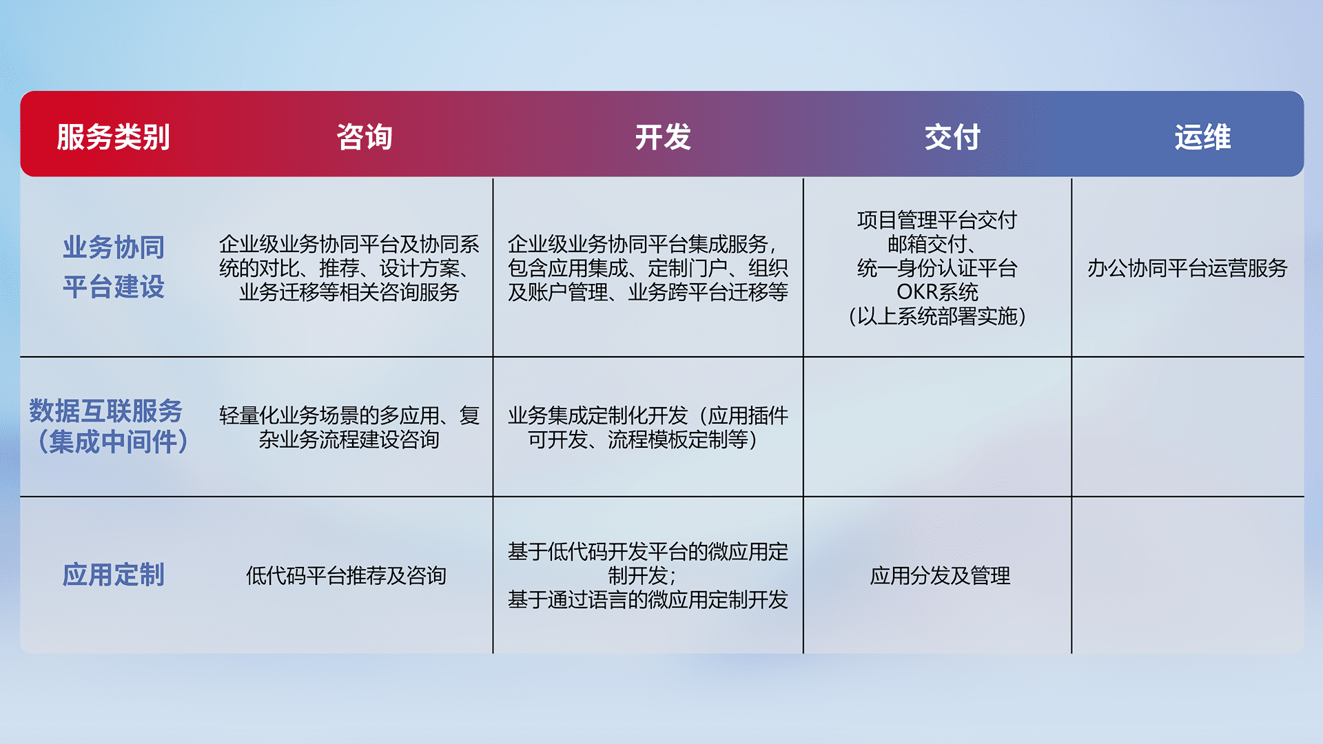 针对钉钉、、、、企微、、、、IDaas等平台级产品提供产品的规划、、方案、、、、交付、、、定制化开发等服务,,,,实现如统一协同办公、、、、智能客户服务、、混合会议管理、、智能数据查询、、、、等业务场景,,实现数字化转型。。